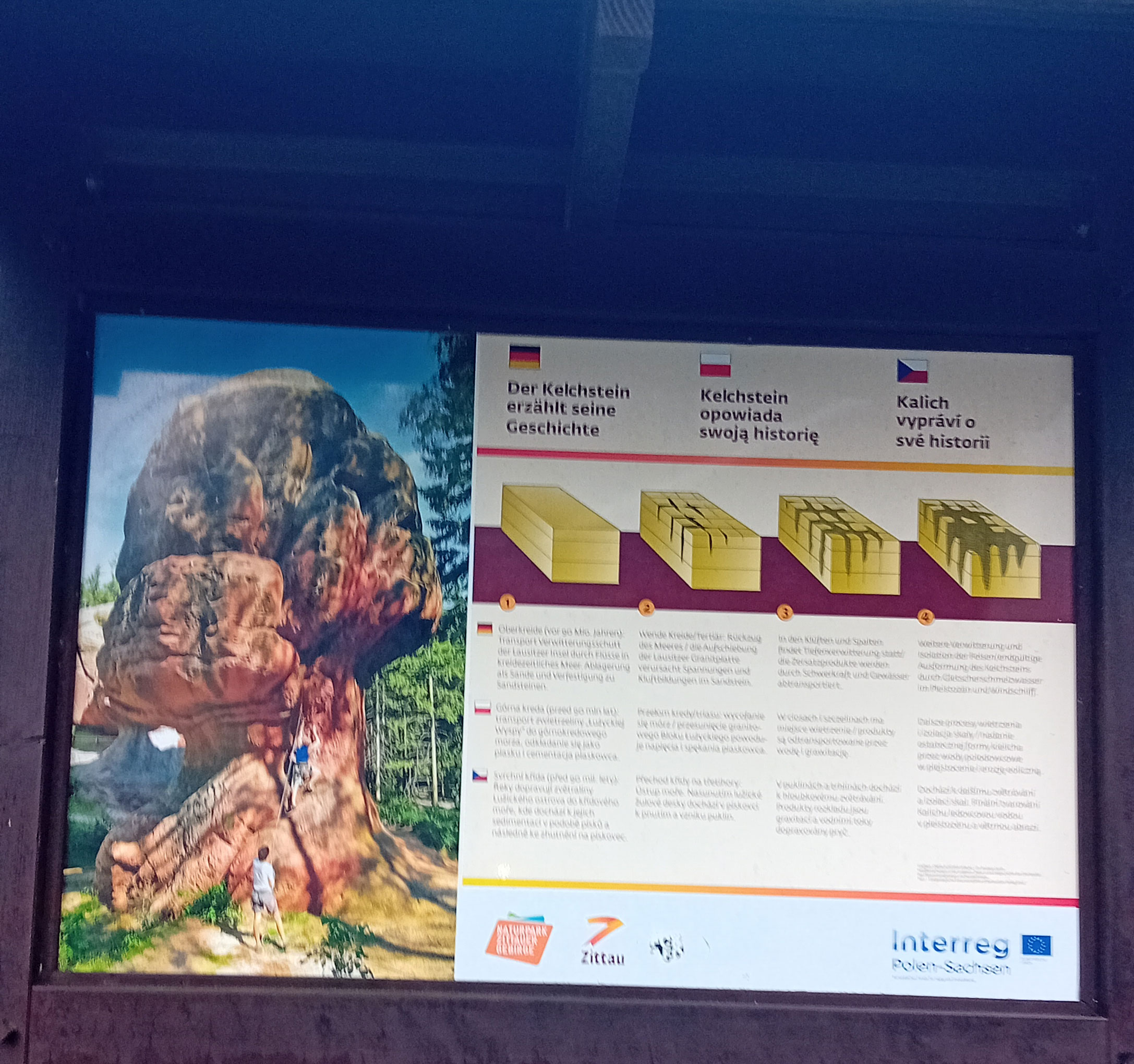 Zitat Oberlausitz.de: Am Zittauer Gebirge begeistern nicht nur die sanften Berge und grünen Täler, sondern auch ganz besondere Gesteinsformationen. Der 17 Meter hohe Kelchstein bei Oybin ist ein durch Windschliff und Erosion geformtes Meisterwerk der Natur. Der pilzartige Sandstein ist ein beliebter Kletterfelsen. Doch Vorsicht! Bei Nässe sollte der Stein keinesfalls bestiegen werden. Der Kelchstein ist eines der Wahrzeichen des Zittauer Gebirges.